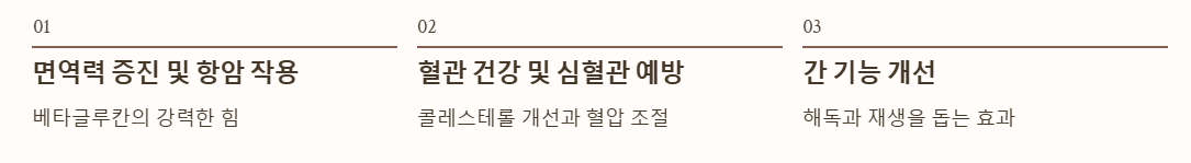 | 베타글루칸 | 면역 세포(NK세포) 활성화 | 항암 효과 및 면역력 강화 |
