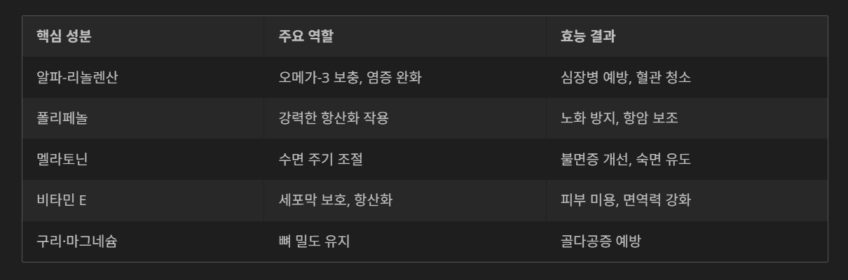 | 알파-리놀렌산 | 오메가-3 보충, 염증 완화 | 심장병 예방 및 혈관 청소 |