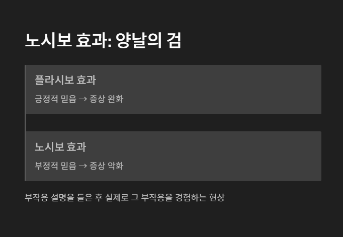 플라시보 효과가 긍정적인 기대에서 비롯된다면, 노시보 효과는 “부작용이 있을 것 같다”는 부정적 믿음에서 실제 불편함이 나타나는 현상입니다.