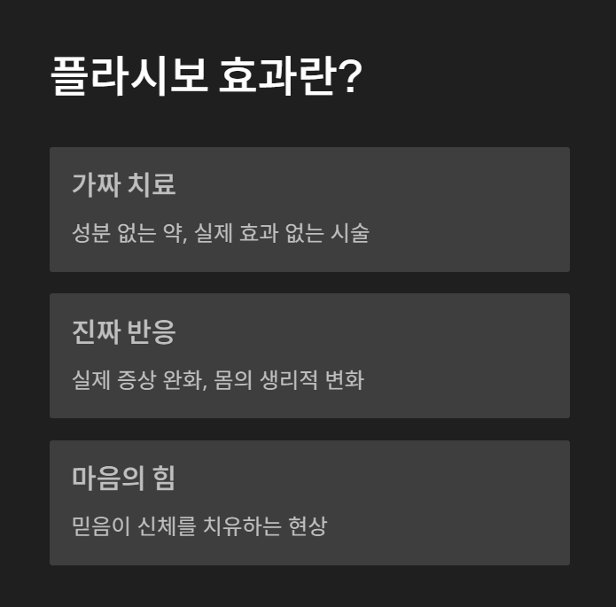 - 플라시보 효과는 믿음과 기대가 실제 신체 반응으로 이어지는 과학적 현상입니다.
