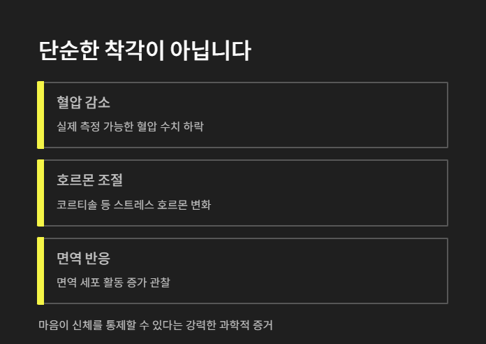 - 신체적 반응 유도: 단순한 기분 전환이 아니라 혈압이 낮아지거나 호르몬 분비가 조절되는 등 실질적인 생리적 변화가 관찰됩니다. 이는 마음이 신체를 통제할 수 있다는 강력한 증거로 활용됩니다.