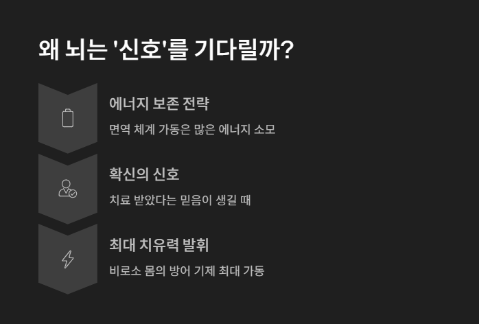 - 치유의 비용: 면역 체계를 가동하고 통증을 억제하는 것은 많은 에너지를 소모하는 일입니다. 뇌는 상황이 호전될 것이라는 확신(플라시보 신호)이 들 때 비로소 몸의 방어 기제를 최대치로 가동합니다.
