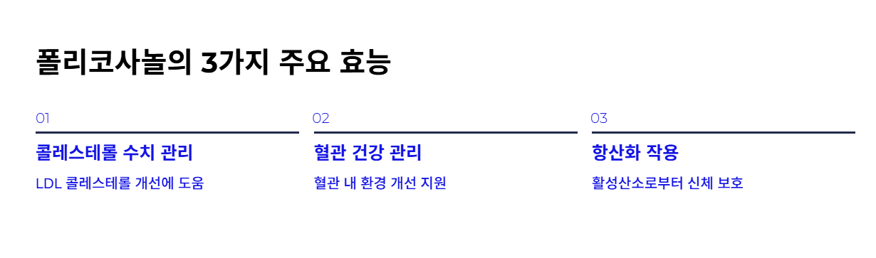 이 때문에 폴리코사놀은 단순히 콜레스테롤 관리뿐 아니라 전반적인 건강 관리 성분으로 함께 언급되곤 합니다.