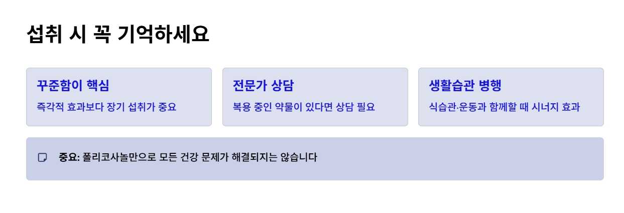 폴리코사놀은 건강기능식품 성분이기 때문에 약처럼 즉각적인 효과를 기대하기보다는 꾸준한 섭취가 중요합니다. 또한 개인의 건강 상태나 복용 중인 약물에 따라 전문가 상담이 필요한 경우도 있습니다.