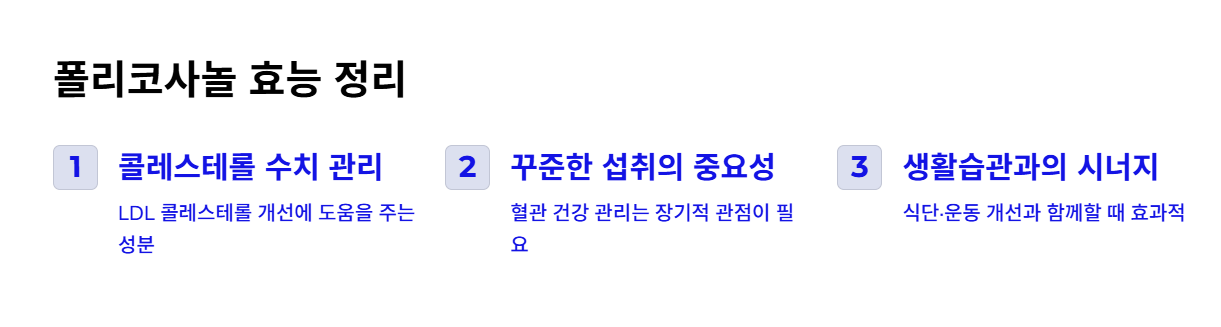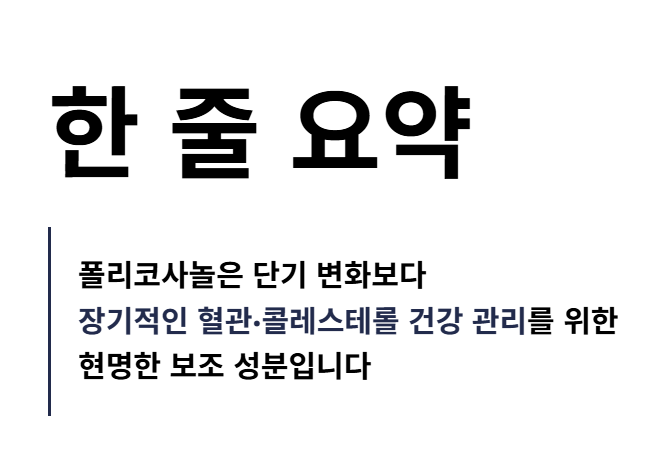 폴리코사놀은 단기간의 변화보다, 장기적인 혈관·콜레스테롤 건강 관리를 위한 보조 성분으로 이해하는 것이 가장 현명합니다.