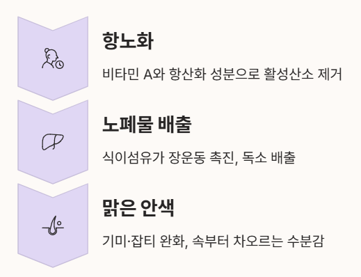 - 노폐물 배출: 둥글레차는 식이섬유가 풍부하여 장운동을 돕고 체내 독소를 밖으로 배출하는 해독 작용을 합니다.