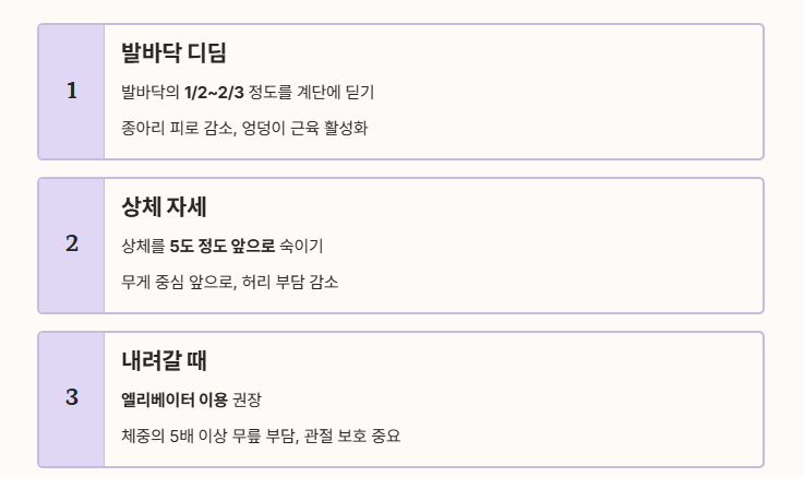 - 발바닥 앞부분만 쓰지 마세요: 발바닥의 1/2에서 2/3 정도를 계단에 딛어야 종아리 피로를 줄이고 엉덩이 근육을 제대로 사용할 수 있습니다.
