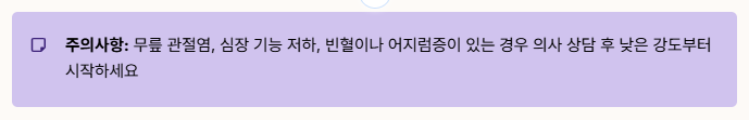 주의사항: 무릎 관절염이 심하거나 심장 기능이 현저히 약한 분, 빈혈이나 어지럼증이 있는 분은 의사와 상담 후 낮은 강도부터 시작해야 합니다.