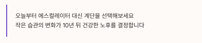 - 내려갈 때는 엘리베이터를 이용하세요: 계단을 내려갈 때는 체중의 5배 이상이 무릎에 가해집니다. 관절 보호를 위해 오르기만 운동으로 하고, 내려올 때는 엘리베이터를 타는 것이 장기적으로 건강에 유리합니다.