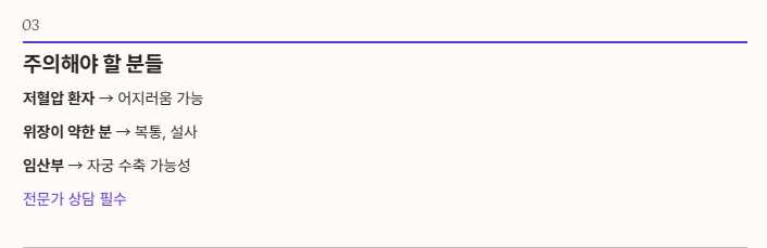 - 저혈압 환자: 혈압을 낮추는 성질이 있어 기운이 빠지거나 어지러울 수 있습니다.