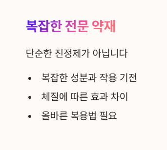 | 추천 상황 | 시험, 면접, 급성 스트레스 | 수험생 보약, 노약자 기력 저하 |