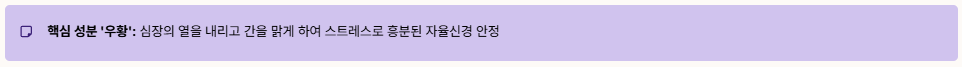 - 자율신경계 조절: 주성분인 '우황'은 심장의 열을 내리고 간을 맑게 하는 성질이 있습니다. 이는 스트레스로 인해 흥분된 자율신경을 안정시켜 가슴 두근거림, 손 떨림, 안면 홍조 등을 완화합니다.