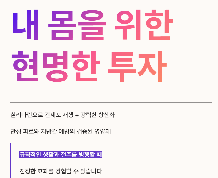 - 분석 의견: 단순히 독소를 거르는 것을 넘어, 간 스스로를 수리할 수 있는 환경을 만들어준다는 점에서 밀크씨슬은 '간 재생의 조력자'라 할 수 있습니다.