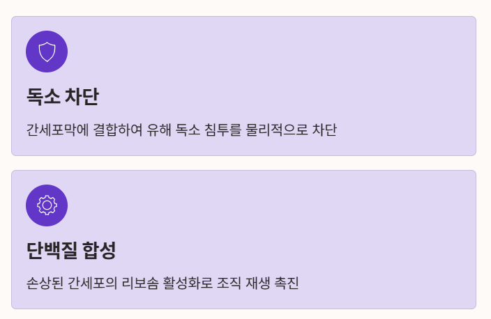 | 주요 작용 | 간세포 재생, 항산화, 해독 | 담즙 분비 촉진, 독소 배출 |
