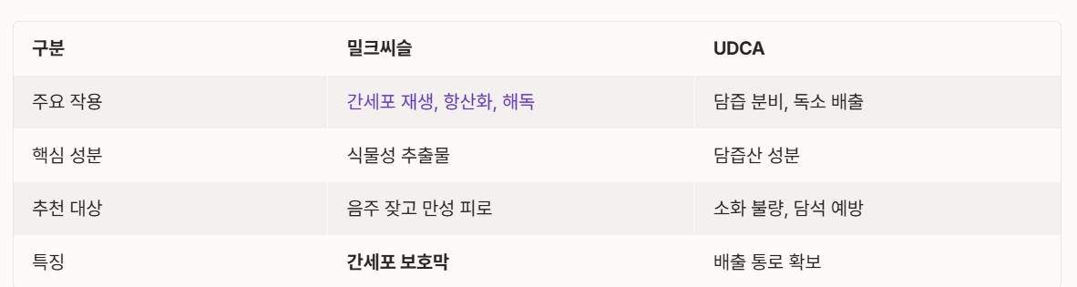 | 구분 | 밀크씨슬 (실리마린) | UDCA (우루사 성분) |