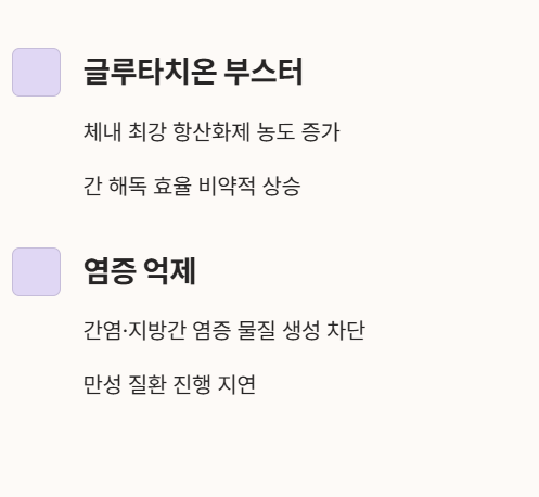 - 숙취 해소 보조: 알코올 분해 과정에서 발생하는 아세트알데히드로부터 간세포를 보호하여 숙취를 줄이고 손상을 최소화합니다.