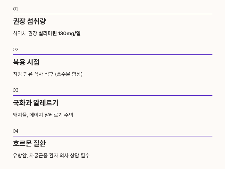 - 호르몬 관련 질환: 실리마린은 에스트로겐과 유사한 작용을 할 수 있어 유방암, 자궁근종 환자는 반드시 의사와 상의해야 합니다.