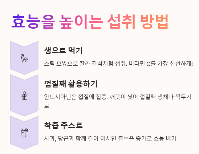 - 껍질째 활용하기: 안토시아닌은 콜라비 껍질에 집중되어 있습니다. 깨끗이 씻은 후 껍질째 채를 썰어 콜라비 생채나 깍두기를 만들어 보세요.
