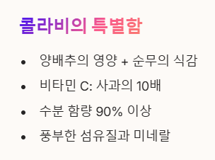 제철을 맞은 신선한 콜라비를 장바구니에 담아보세요. 아삭한 콜라비 조각 하나가 여러분의 하루를 더 건강하고 활기차게 바꿔줄 것입니다. 콜라비 효능을 제대로 누리며 더 건강한 삶을 영위하시길 응원합니다.