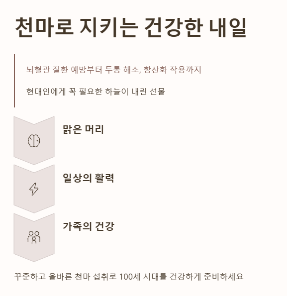 꾸준하고 올바른 천마 섭취 습관은 여러분의 머리를 맑게 하고 일상의 활력을 되찾아줄 것입니다. 오늘 전해드린 천마 효능 가이드가 여러분과 가족의 건강한 삶을 위한 소중한 이정표가 되기를 바랍니다.