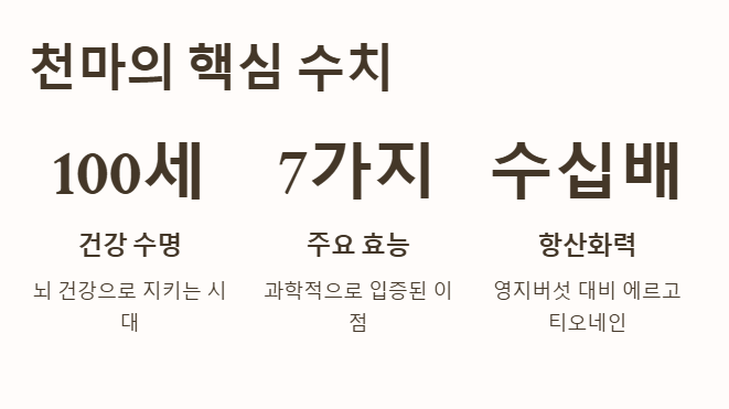 천마에는 영양제의 제왕이라 불리는 '에르고티오네인'이 영지버섯보다 수십 배 많이 들어있습니다. 이 성분은 강력한 항산화 작용을 통해 체내 활성산소를 제거하는 핵심적인 천마 효능을 담당합니다. 노화를 늦추고 세포 손상을 막고 싶다면 천마 섭취를 강력히 추천합니다.