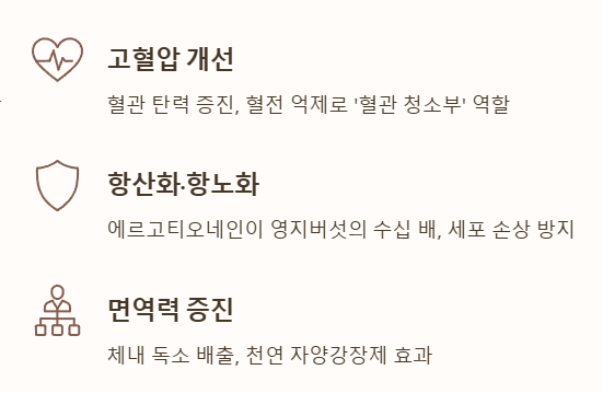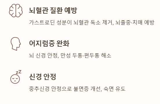 | 핵심 효과 | 뇌 질환, 마비, 고혈압 예방 | 위벽 보호, 소화 촉진, 스테미나 |