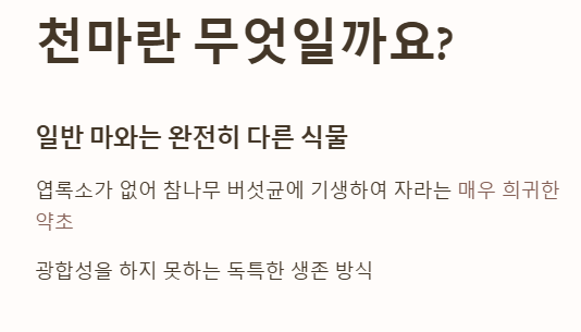 많은 분이 이름 때문에 천마를 일반적인 산마(마)와 혼동하시곤 합니다. 하지만 천마는 일반 마와는 생태부터 완전히 다른 식물입니다. 일반 마는 스스로 광합성을 하지만, 천마는 엽록소가 없어 참나무 버섯균에 기생하여 자라는 매우 희귀한 약초입니다.