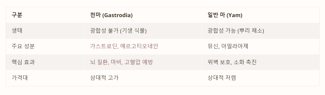 | 구분 | 천마 (Gastrodia) | 일반 마 (Yam) |