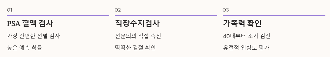 - PSA(전립선 특이항원) 검사: 혈액 검사만으로도 전립선 암 초기증상 여부를 높은 확률로 예측할 수 있는 가장 간편한 방법입니다.