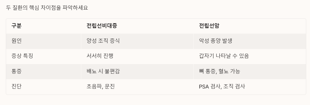 | 원인 | 전립선 조직의 양성 증식 | 전립선 세포의 악성 종양 |