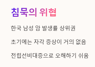전립선암은 한국 남성 암 발생률 상위권을 차지할 정도로 흔해졌지만, 불행히도 초기에는 아무런 자각 증상이 없는 경우가 대부분입니다. 많은 환자가 단순히 나이가 들어 생기는 전립선비대증으로 오해하여 전립선 암 초기증상을 놓치곤 합니다.