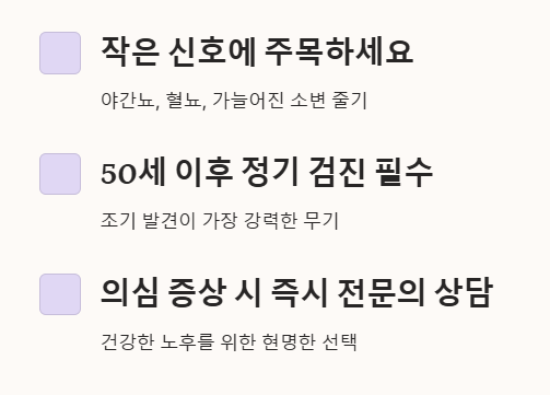 50세 이후에는 정기적인 검진을 생활화하고, 의심되는 전립선 암 초기증상이 느껴진다면 주저하지 말고 전문의를 찾으세요. 조기 발견은 전립선암을 이겨내는 가장 강력한 무기입니다. 오늘 정리해 드린 전립선 암 초기증상 가이드가 여러분의 건강한 노후를 위한 이정표가 되길 바랍니다.