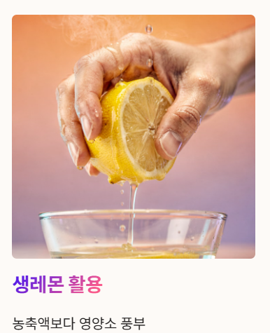- 생레몬 활용하기: 시중에 파는 농축액보다는 신선한 생레몬을 직접 짜서 마시는 것이 영양소 보존 면에서 훨씬 유리합니다.