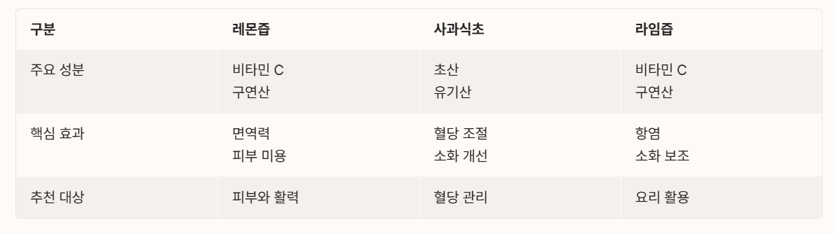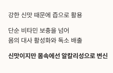 | 주요 성분 | 비타민 C, 구연산 | 초산, 유기산 | 비타민 C, 구연산 |