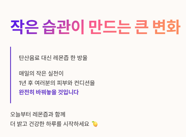 오늘부터 탄산음료나 설탕 든 주스 대신, 상큼한 레몬즙 한 방울을 섞은 물로 건강을 챙겨보시는 건 어떨까요? 매일 쌓이는 작은 습관이 1년 뒤 여러분의 피부와 컨디션을 완전히 바꿔놓을 것입니다. 레몬즙 효능과 함께 더 밝고 건강한 하루를 시작하세요!