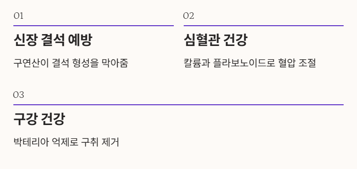 | 핵심 효과 | 면역력, 피부, 결석 예방 | 혈당 조절, 소화 개선 | 항염, 소화 보조 |