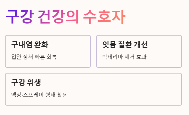 입안이 헐거나 잇몸 질환이 있을 때 프로폴리스 효능은 빛을 발합니다. 액상 형태의 제품을 입안에 사용하면 구강 내 박테리아를 제거하고 상처 회복을 돕는 프로폴리스 효능을 직접 체험할 수 있습니다.