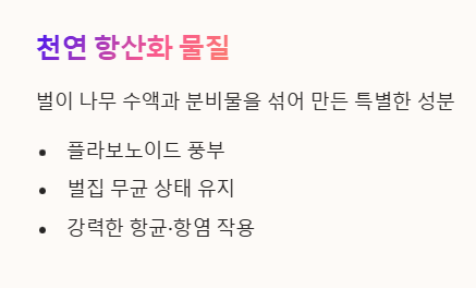 프로폴리스 효능은 피부 재생을 돕고 여드름 등 피부 트러블 완화에 효과적입니다. 화장품 원료로도 많이 쓰이는 이유는 이러한 피부 진정 및 재생 프로폴리스 효능 때문입니다.