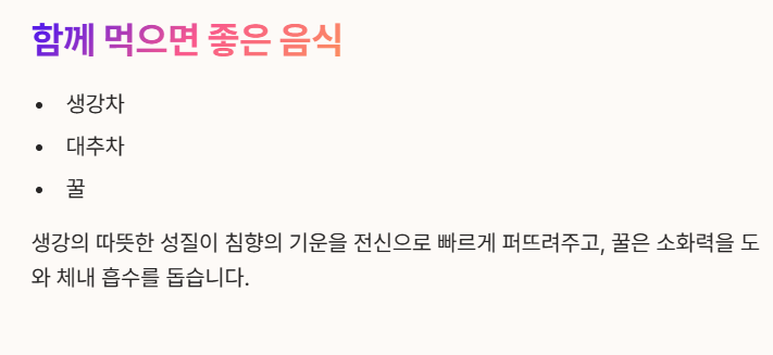 - 함께 먹으면 좋은 음식: 생강차, 대추차, 꿀