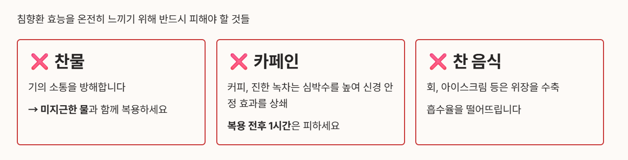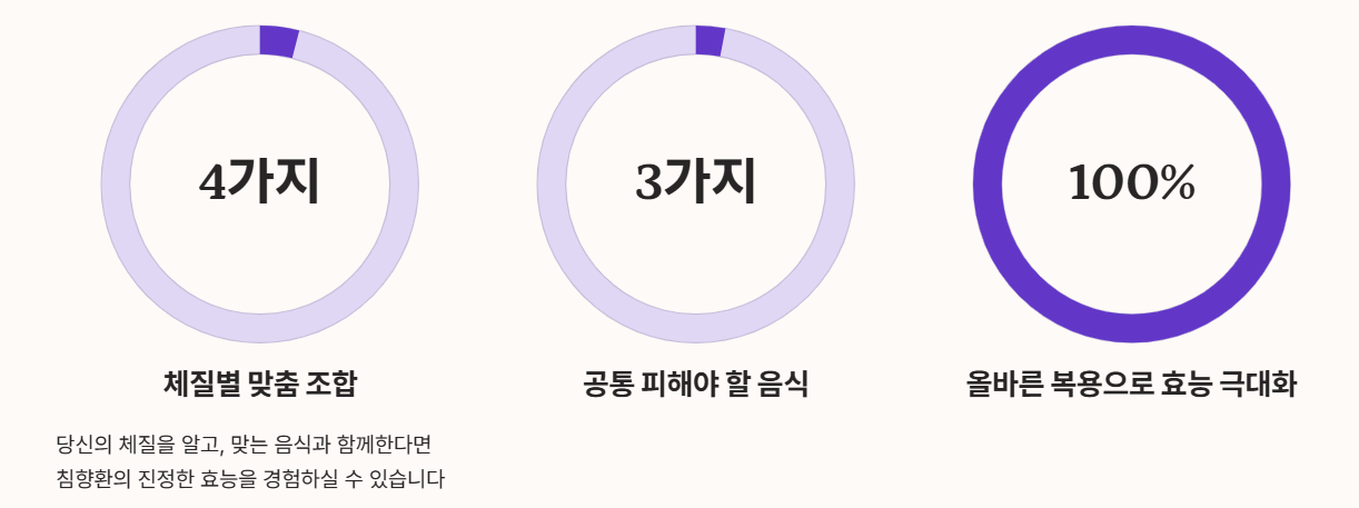 소음인은 소화기가 약해 침향환 효능이 흡수되지 못하고 겉도는 경우가 많습니다. 이때는 위장을 따뜻하게 데워주는 음식과 함께 드세요.
