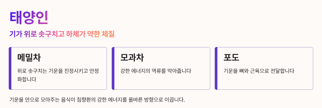 태양인은 기운이 밖으로 발산되는 성질이 강하므로, 기운을 안으로 모아주는 음식이 필요합니다.