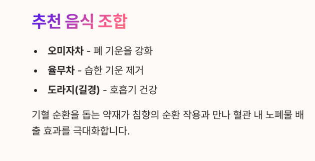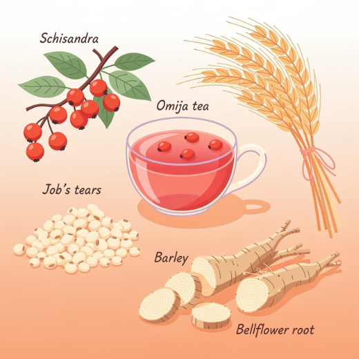 - 함께 먹으면 좋은 음식: 오미자차, 율무차, 도라지(길경)