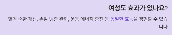 - A1. 당연합니다. 여성의 혈액 순환 개선, 손발 차가움 완화, 운동 시 에너지 증진 등 동일한 아르기닌의 효능을 볼 수 있습니다.
