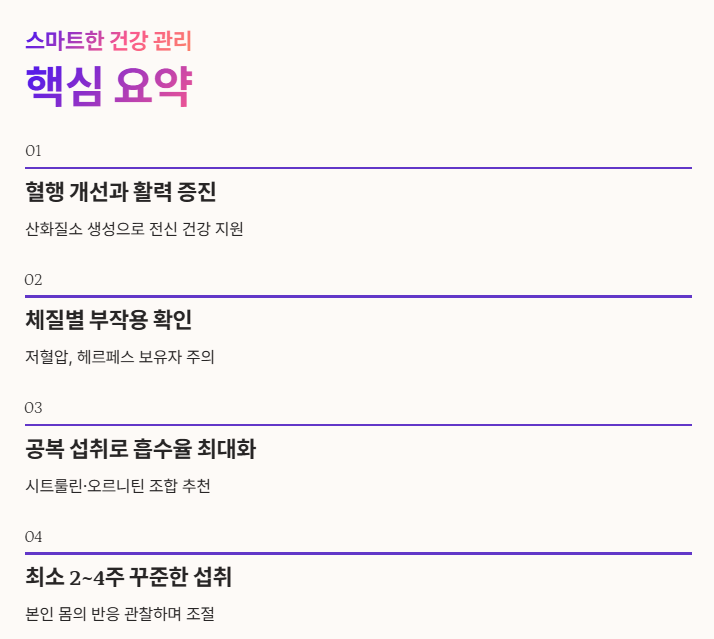 아르기닌의 효능은 혈행 개선과 활력 증진에 탁월하지만, 개인의 체질에 따른 부작용을 숙지하고 공복에 흡수율을 높여 섭취하는 것이 핵심입니다.