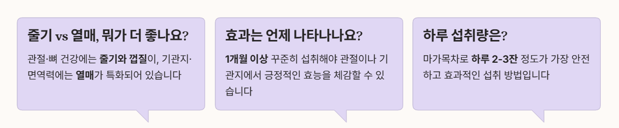 A. 관절과 뼈 건강에는 줄기와 껍질이, 기관지와 면역력에는 열매의 마가목 효능이 더 특화되어 있습니다. 용도에 맞게 선택하세요.