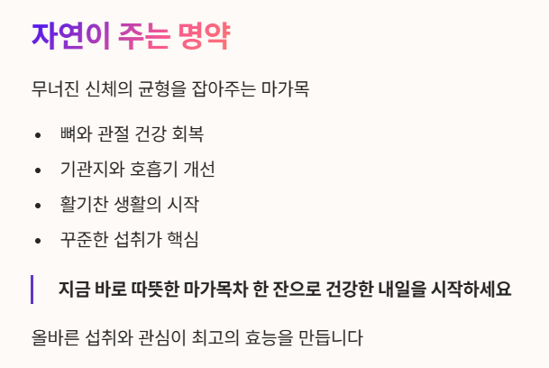 마가목 효능은 단순한 약재의 수준을 넘어, 무너진 신체의 균형을 잡아주는 자연의 명약입니다. 특히 뼈와 관절이 약해지는 시기에 마가목 효능을 곁들인다면 훨씬 더 건강하고 활기찬 생활을 영위할 수 있습니다.