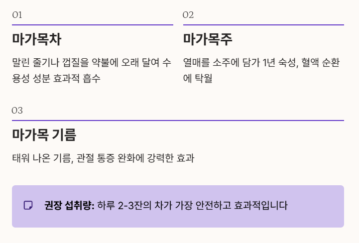 - 마가목차: 말린 줄기나 껍질을 물에 넣고 약불에서 오래 달여 마시면 수용성 성분인 마가목 효능을 효과적으로 흡수할 수 있습니다.