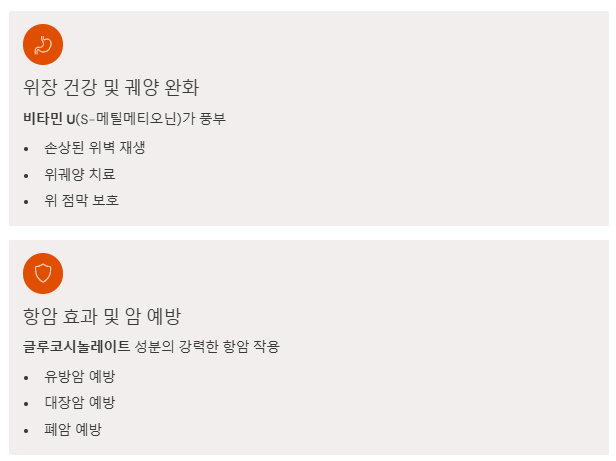 양배추 효능 속 글루코시놀레이트 성분은 강력한 항암 작용을 합니다. 특히 유방암, 대장암, 폐암 예방에 도움을 준다는 연구 결과가 많아 항암 식단에서 양배추 효능은 빠지지 않고 등장합니다.