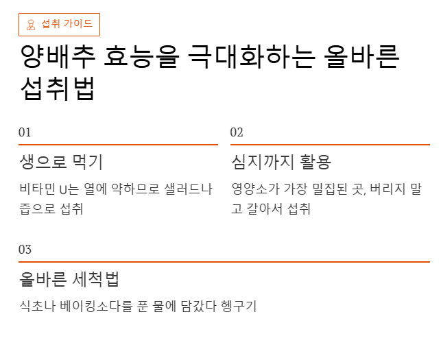 - 생으로 먹기: 비타민 U는 열에 약하므로 가급적 생으로 샐러드나 즙으로 먹는 것이 양배추 효능 보존에 가장 좋습니다.