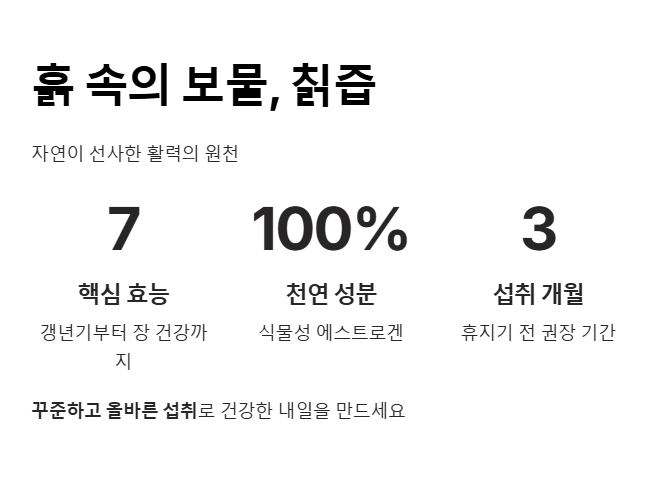 가장 독보적인 칡즙 효능은 여성 호르몬 불균형을 잡아주는 것입니다. 석류보다 훨씬 풍부한 식물성 에스트로겐이 함유되어 안면홍조, 발열, 가슴 두근거림 등 갱년기 불편함을 줄여주는 강력한 칡즙 효능을 발휘합니다.